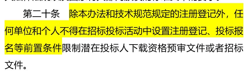 早在之前国家发改委和住建部等八部委公布第20号令《电子招标投标办法》中也明确规定:除本办法和技术规范规定的注册登记外,任何单位和个人不得在招标投标活动中设置注册登记、投标报名等前置条件限制潜在投标人下载资格预审文件或者招标文件。
