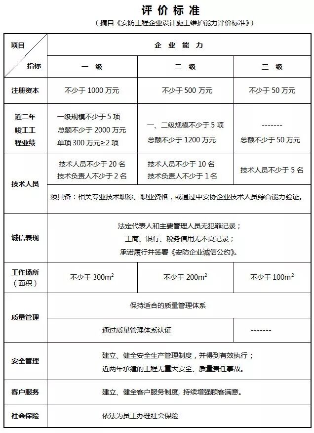 安防工程企业设计施工维护能力评价工作是中国安全防范产品行业协会(以下简称:中安协)为推进安防行业自律机制,规范从业行为,防范和抵御不法侵害,保护企业合法权益,营造公平、有序、诚信的安防市场环境,经报公安部科信局批准,在全国开展的一项行业自律性工作。根据中安协能力评价体系文件规定,企业能力按企业规模、工程业绩、管理水平、诚信表现,设为一级、二级、三级共三个等级,三级为最低级别。企业采取自愿、免费的方式进行能力证书申报。能力证书每年年审,每三年进行复评。持能力证书企业在中安协官网上公示,并接受社会监督。能力评价按照属地管理原则,由中安协在全国各省级、直辖市安防协会设立能评分中心,负责辖区内的能力评价服务工作,原则上每个省或直辖市仅设立一个能评分中心承担能评工作。