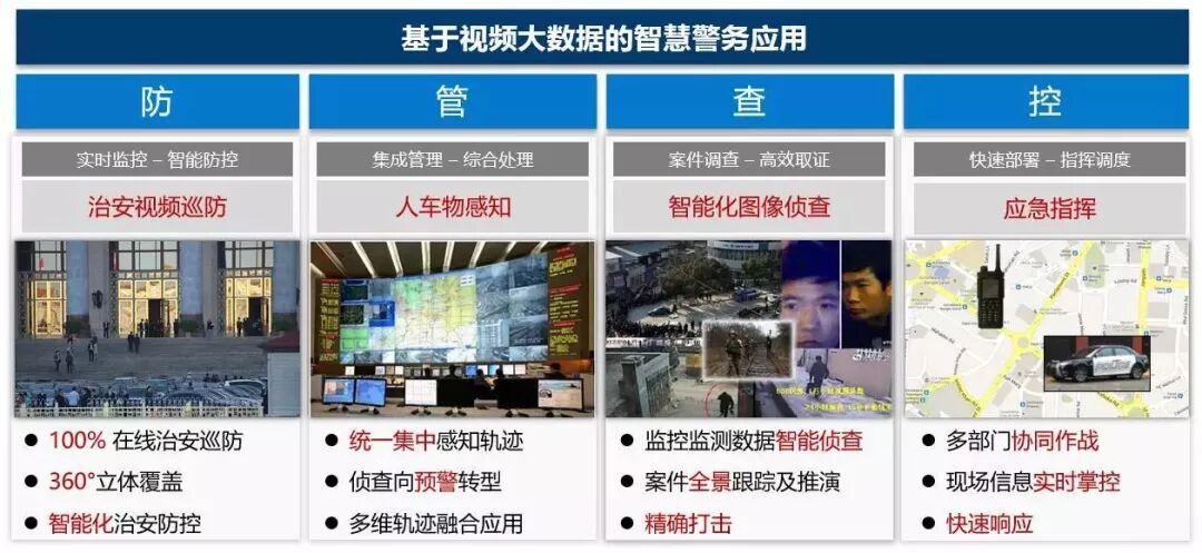 核心之三:在公安视频专网内建设公安信息化指挥中心,搭建公安图像综合应用平台、视频解析应用平台、车辆大数据应用平台、人像大数据应用平台、公安指挥调度应用平台、图侦实战应用平台等,从防、管、查、控四个方面构筑基于视频大数据的智慧警务应用。