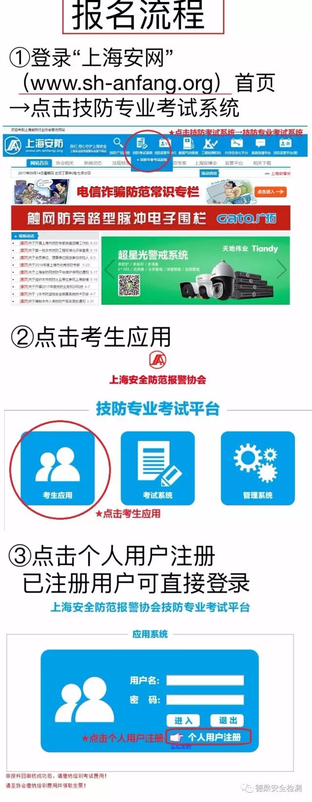 1、未注册考生:登录“上海安防网”(www.sh-anfang.org)首页“技防考试报名系统”进入“考生应用”→进行考生注册→通过审核→选择申请考试科目(请申请“网上申报常见问题”、“安防工程检测常见问题”、“传输系统规范设计”及“视频监控系统应用”四个科目。)→完成科目申请后支付培训费用→报考人员登录“考生应用”→点击“申请查询”检索并下载听课证并按听课证时间准时参加培训。