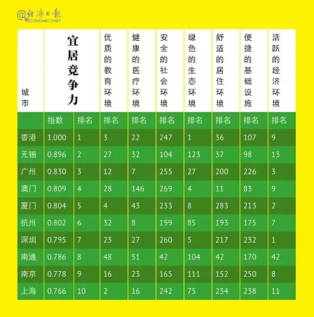 今年的宜居竞争力指标体系更加注重城市在教育、医疗等公共服务以及经济活跃方面的表现,因此与上一年相比,十强城市有明显变动。